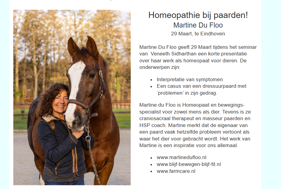 29 mei 2025 geef ik een presentatie over hoe homeopathie bij paarden werkt tijdens een seminar van Veneeth Sidharthan